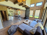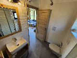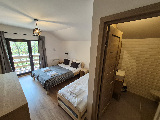 Upstairs, there are two comfortable bedrooms, each furnished with one double bed, two extra single beds, and a private bathroom.