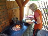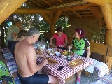 The hungry cyclers can relax in a wonderful place. There is a swing and some hammocks and children can play hide-and-seek in the trunk of a huge tree or they can play ballgames or they can build a reservoir in the clean water. During this time the Denes family fishes for trout and fries them on a disc. The delicious trout lunch will be served on wooden boards in the buttery on the stream bank. After this delicious lunch the adventurers can return home satisfied. The full travelers can enjoy the sloping road to home.